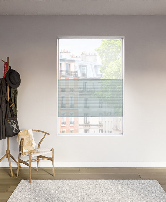 Up & down plissègardin med to håndtak og festesko, som kan justeres toveis opp og ned. Gardinen bygger svært lite i dybde og pakkhøyde, og er derfor svært anvendelig. Tekstilen har èn foldeside med sikksakk-struktur, og med synlige hull til snorene.