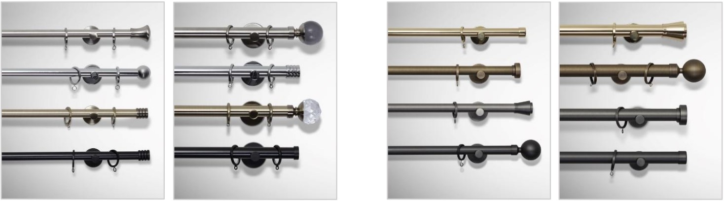 Lux måltilpassede gardinstenger i metall består av både enkle og mer dekorative endedekor som gir mange valgmuligheter for tilpasning til interiøret.