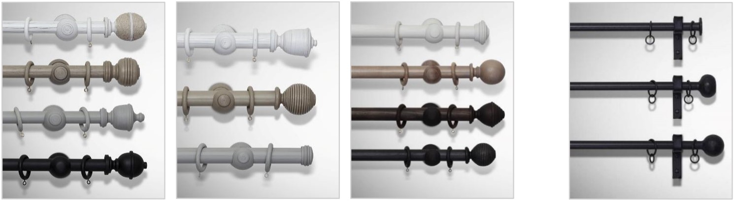 Måltilpassede gardinstenger i tre håndlages i England, der ulike farger og effekter gir hver enkelt gardinstang sin helt spesielle egenart.